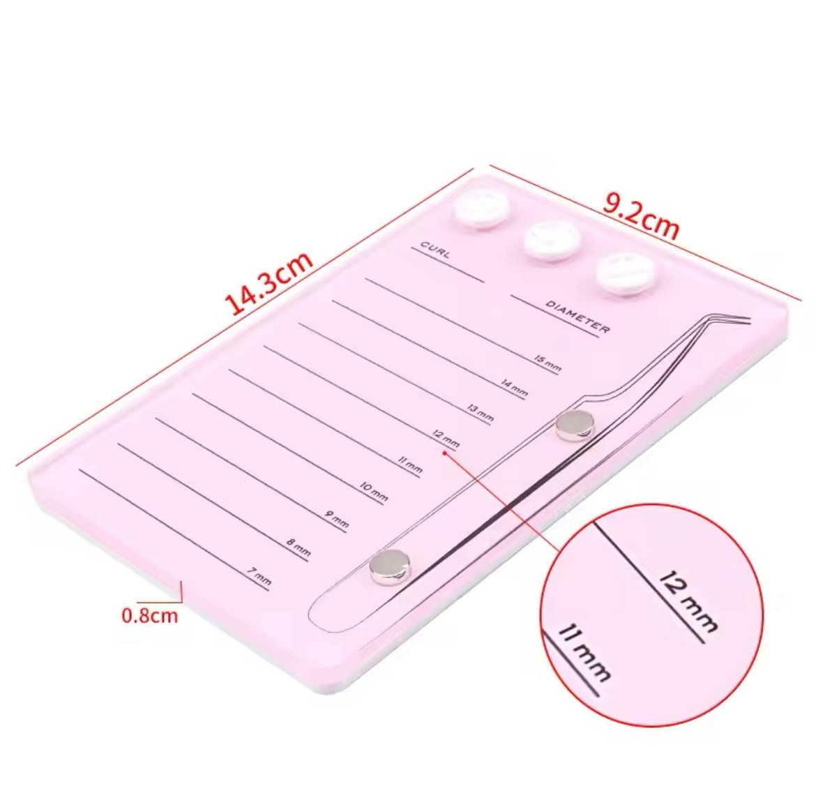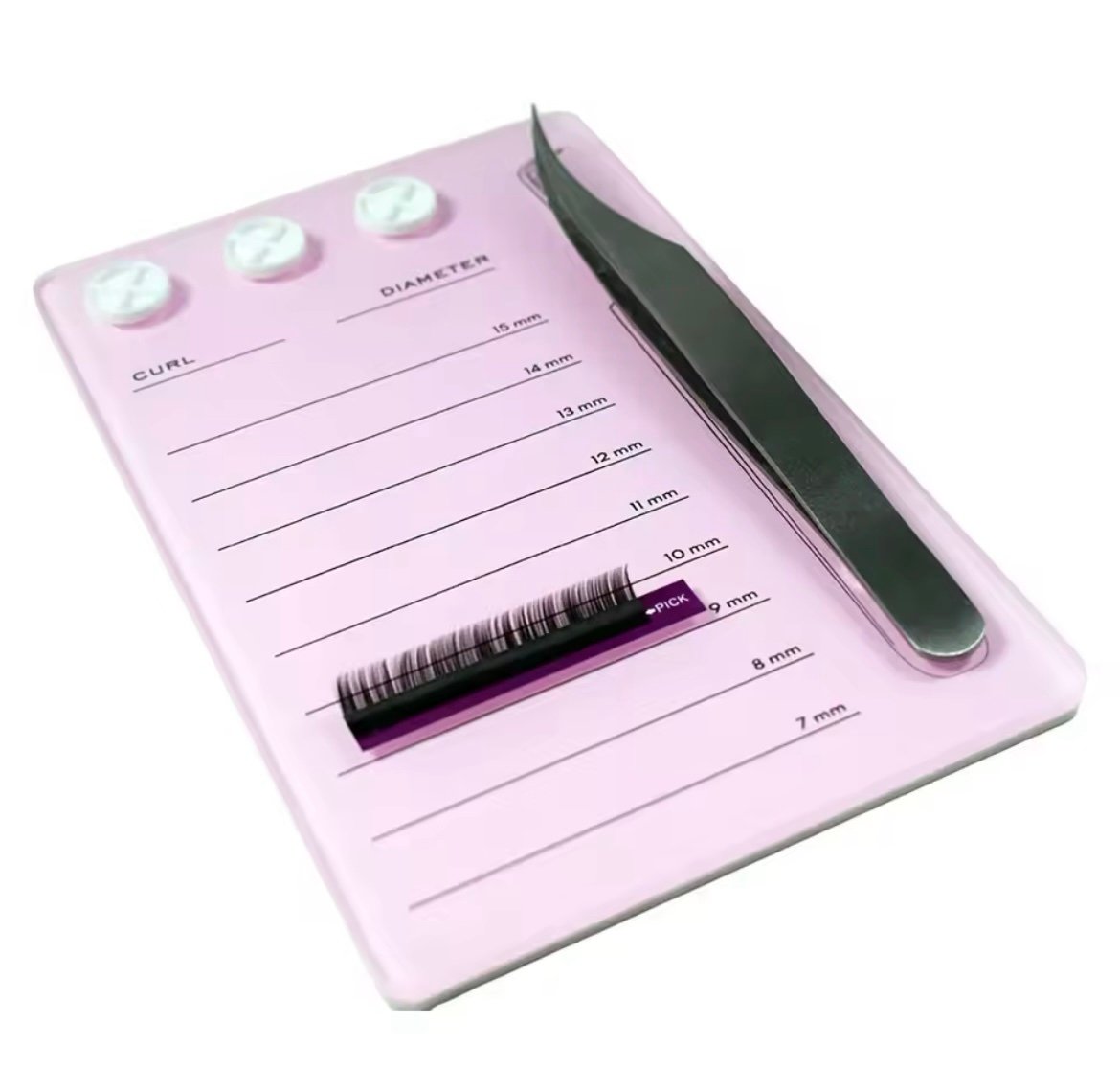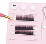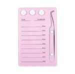 С оразмерени редове за поставяна на лентите мигли , място за поставяне на лепило и магнитна поставка за пинсета .