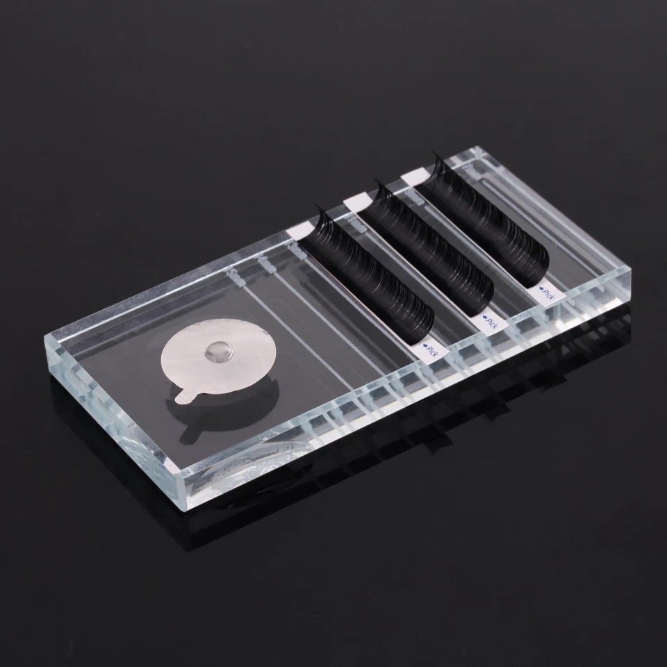 Стъклена поставка за мигли . Лесна за почистване . Размери : 10 / 5 / 1 см .